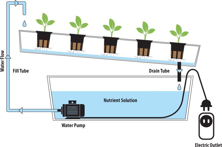 Nutrient film technqiue, or NFT, places plants inside channel gutters so that it’s roots come into direct contact with shallow streams of nutrient infused water. The gutters are angled in a downward slope so that the water automatically travels down in a constant flow cycle, recirculated back up by water pumps. This allows the roots to have direct water and nutrient source 24/7, without the need for daily watering of plants. NFT is most commonly used for leafy vegetables such as lettuce, and various leafy vegetables.